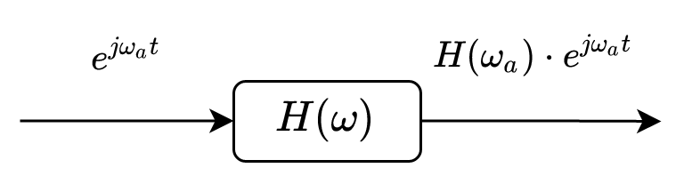 Since the system is linear, each component \(k\) gets multiplied with \(H\left(\frac{2 \pi}{N}k\right)\), so the output signal is: \[y[n] = \frac{1}{N}\sum_{k=0}^{N-1}X_k H\left(\frac{2 \pi}{N}k\right) e^{j 2 \pi k n / N}\]