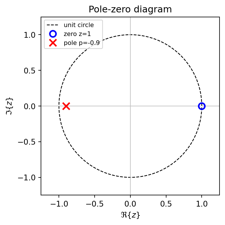 Order 1 means one pole and one zero. The pole has distance \(0.9\) from origin, so we choose a real pole close to high frequencies, at: \[p=-0.9.\]