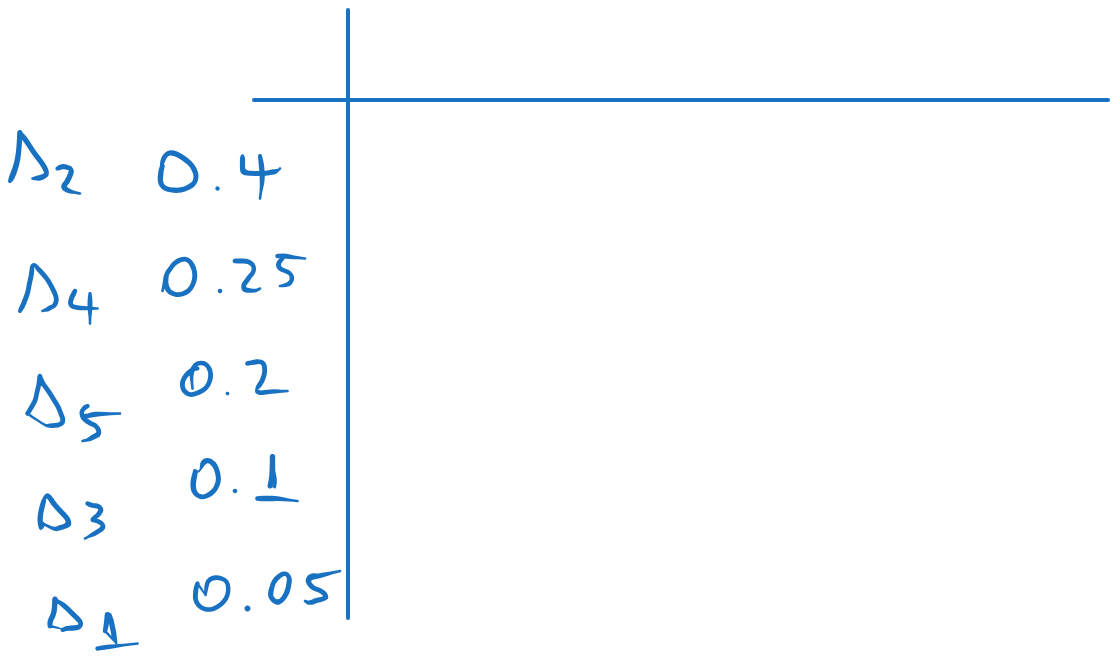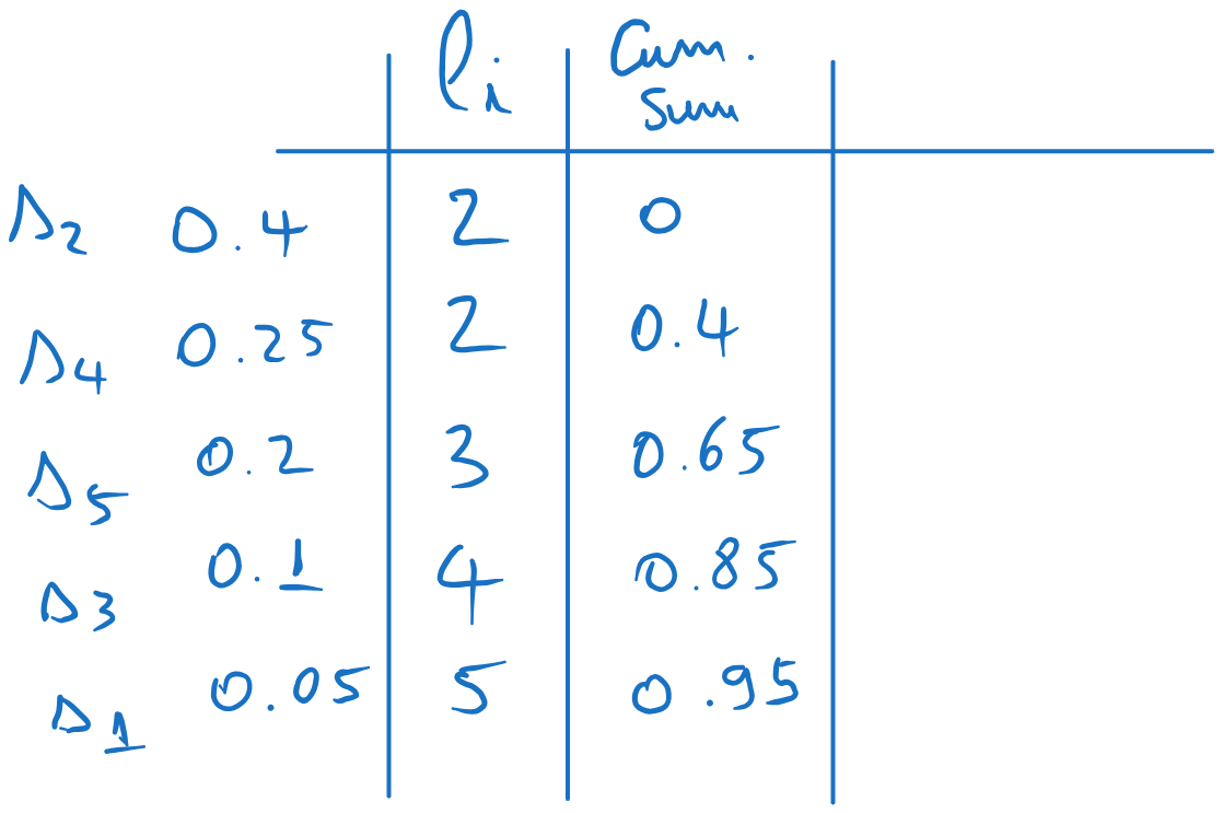 We compute the cumulative sum probabilities, i.e. the sum of the probabilities up to the current row, but not including the current row: