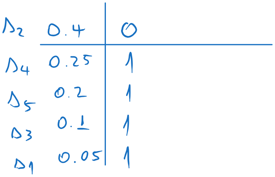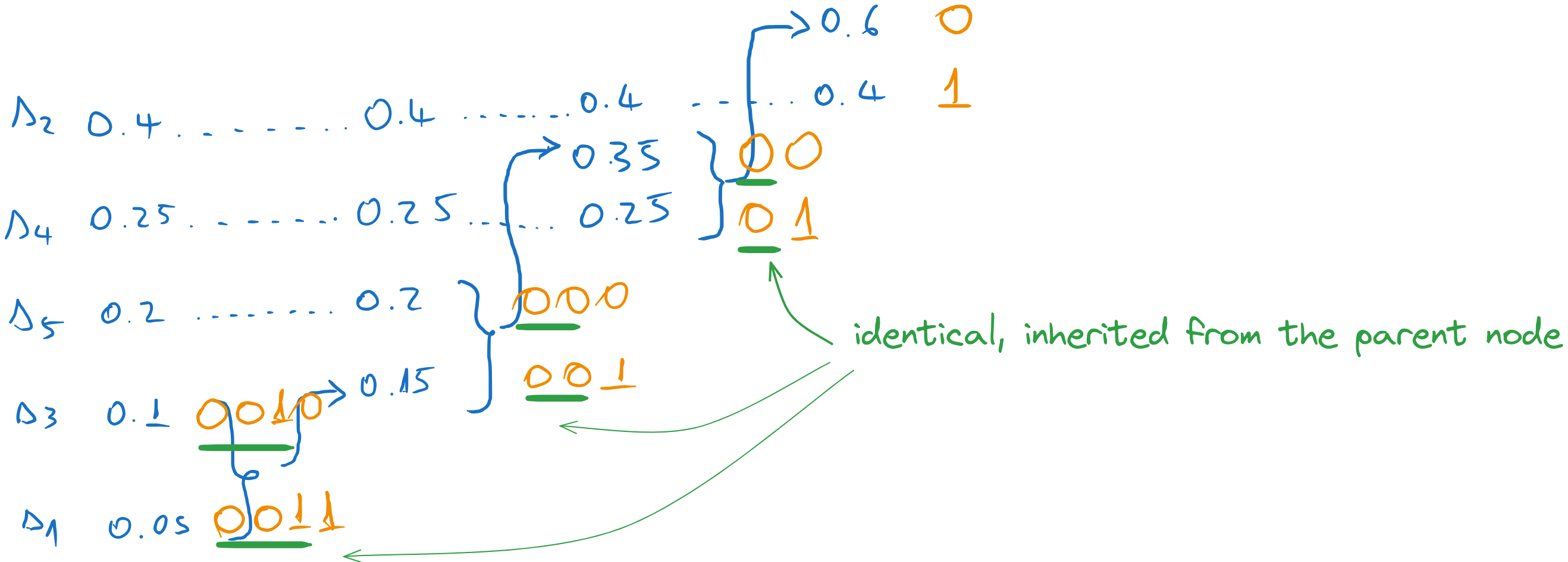 We go one column to the left, and we assign codewords to the two messages which were combined in the previous step. The codewords inherit the codeword of the parent (0), to which we append an extra 0 and 1.