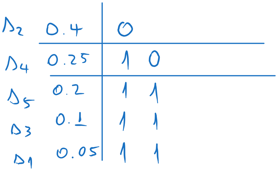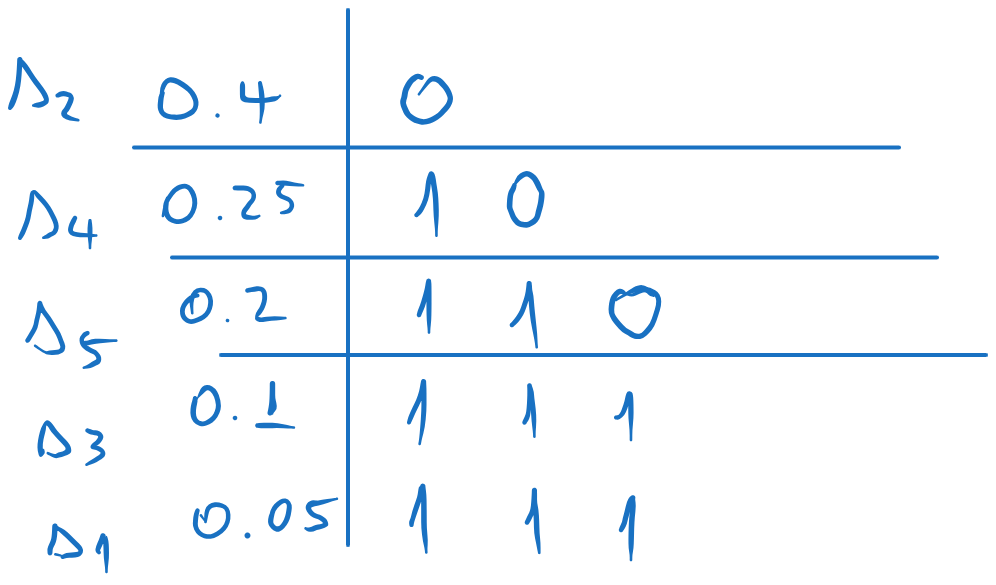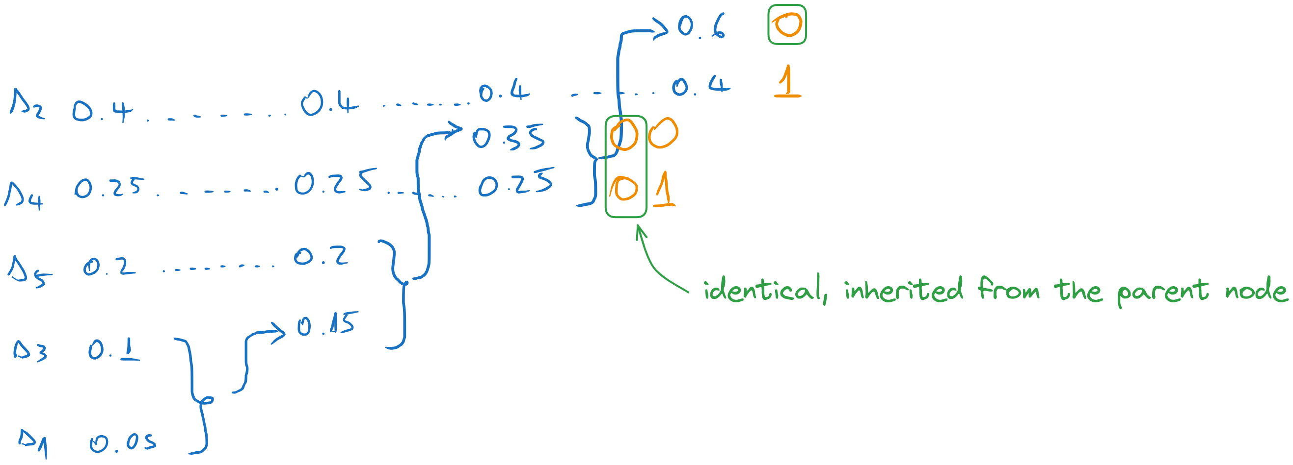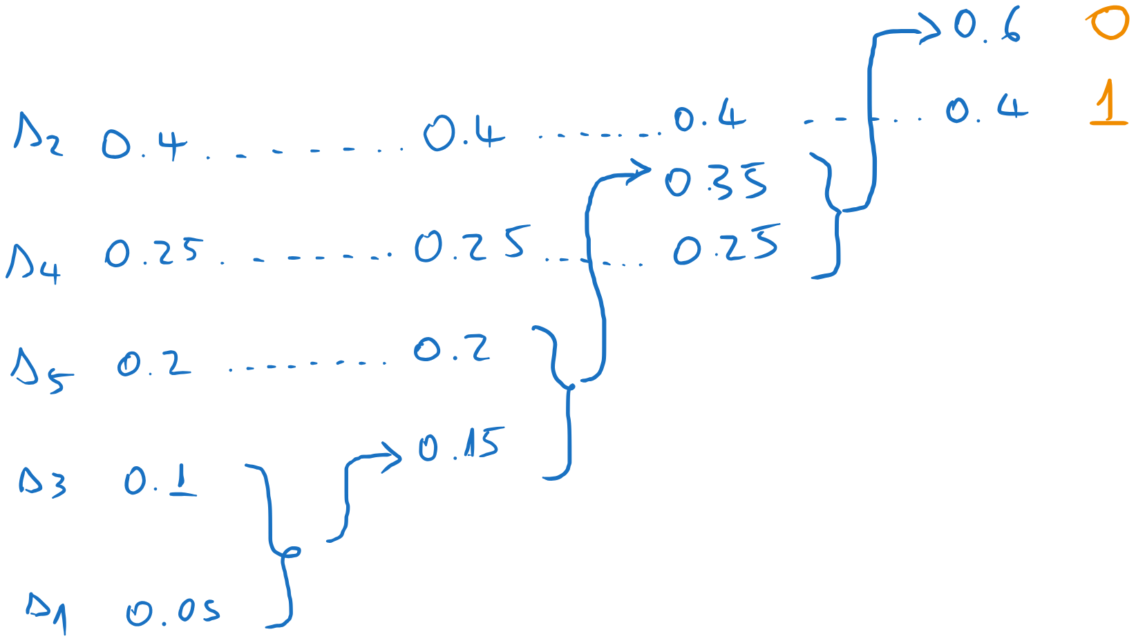 We split the list in two, such that the sum of the probabilities in each part is as close as possible (i.e. as close as possible to ). We assign 0 to one part and 1 to the other.