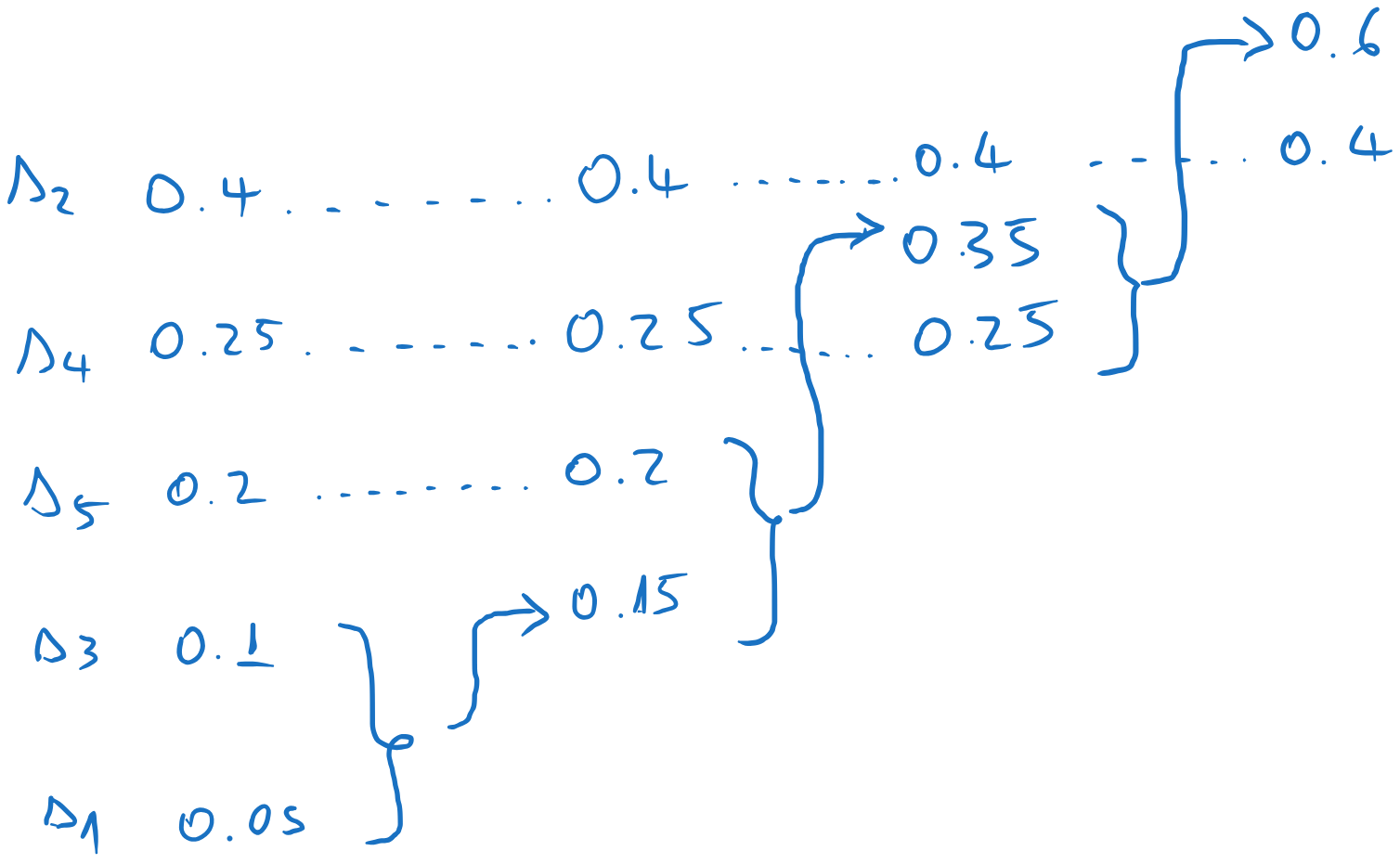 We sum the messages with the lowest probabilities, and we insert the sum in the list, keeping the list sorted. All other messages are kept in the same order. In this case, the combined message ends at the bottom of the list.